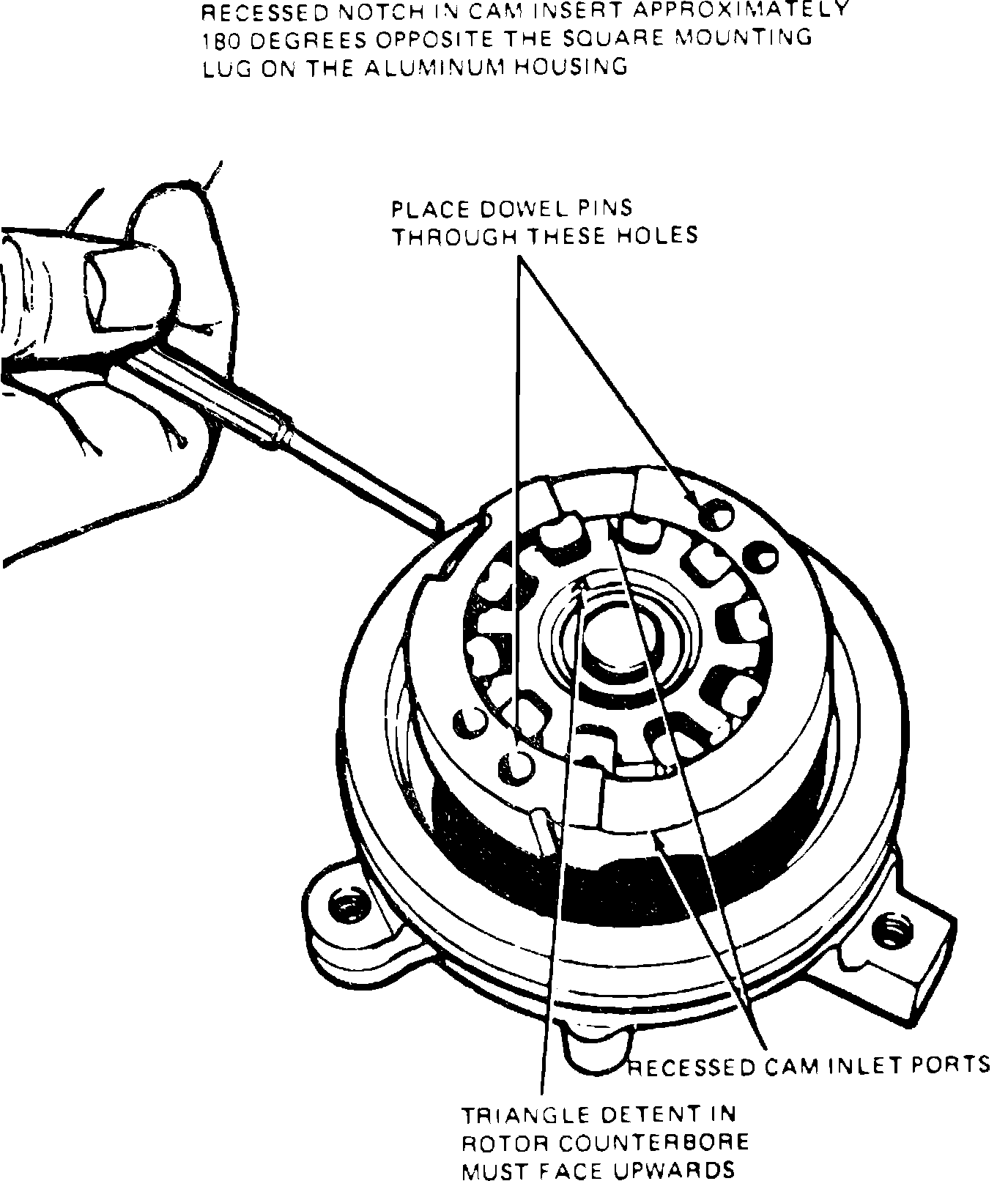 13. Install cam, rotor, rotor and slippers and rotor shaft assembly into pump housing over dowel pins. When installing assembly into pump housing, stepped holes must be used for dowel pins and notch in cam insert must be toward reservoir and approximately 180 degrees opposite square mounting lug on housing, Fig. 6.