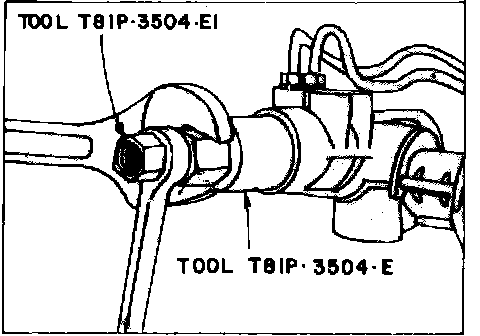 5. The following tools must be used to remove the socket, tool No. T81P-3504-G, or equivalent, a torque wrench and a crescent wrench to hold the rack from rotating, Fig. 29.