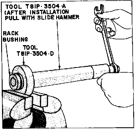 3. Pull the rack, end plate, rack bushing and rack piston out the right side of housing. If rack, end plate, rack bushing and rack bushing assembly are difficult to remove, install tie rod hand tight on rack assembly, then install slide hammer weight over tie rod. Install a nut on tie rod to slide weight against, and use the weight and tie rod assembly as a slide hammer to remove rack assembly.