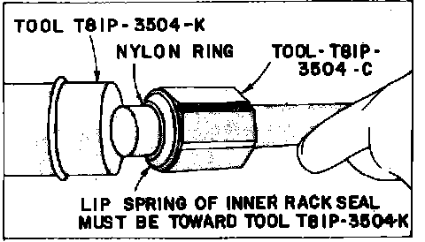 6. Apply gear lube to outer rack oil seal, install oil seal in rack bushing with outer rack oil seal replacer, Fig. 47. Lip spring must face the inside of the bushing, Fig. 48. Install nylon ring in oil seal, Fig. 49.