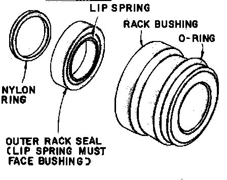 Fig. 50 Installation sequence, rack bushing, seal, nylon ring & end plate. Escort, EXP, LN7, Lynx, Tempo & Topaz: