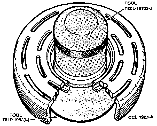 1. Place the clutch pulley friction face on small opening of Tool T80L-19703-E or equivalent as shown.