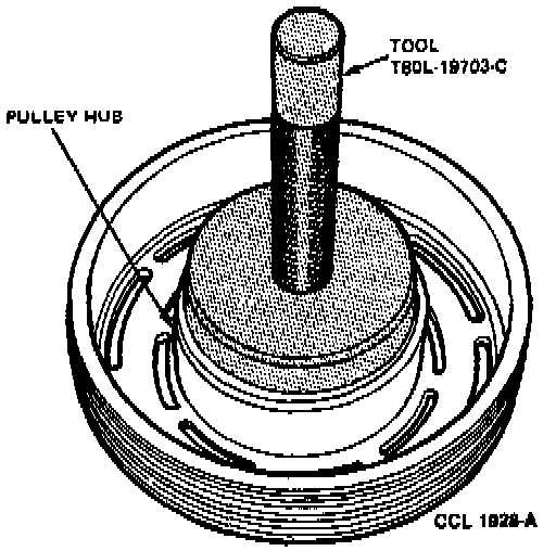 5. Position largest opening of Tool T80L-19703-E or equivalent over the hub of the pulley to support the pulley. Then, drive bearing from pulley with Tool T80L-19703-J or equivalent.