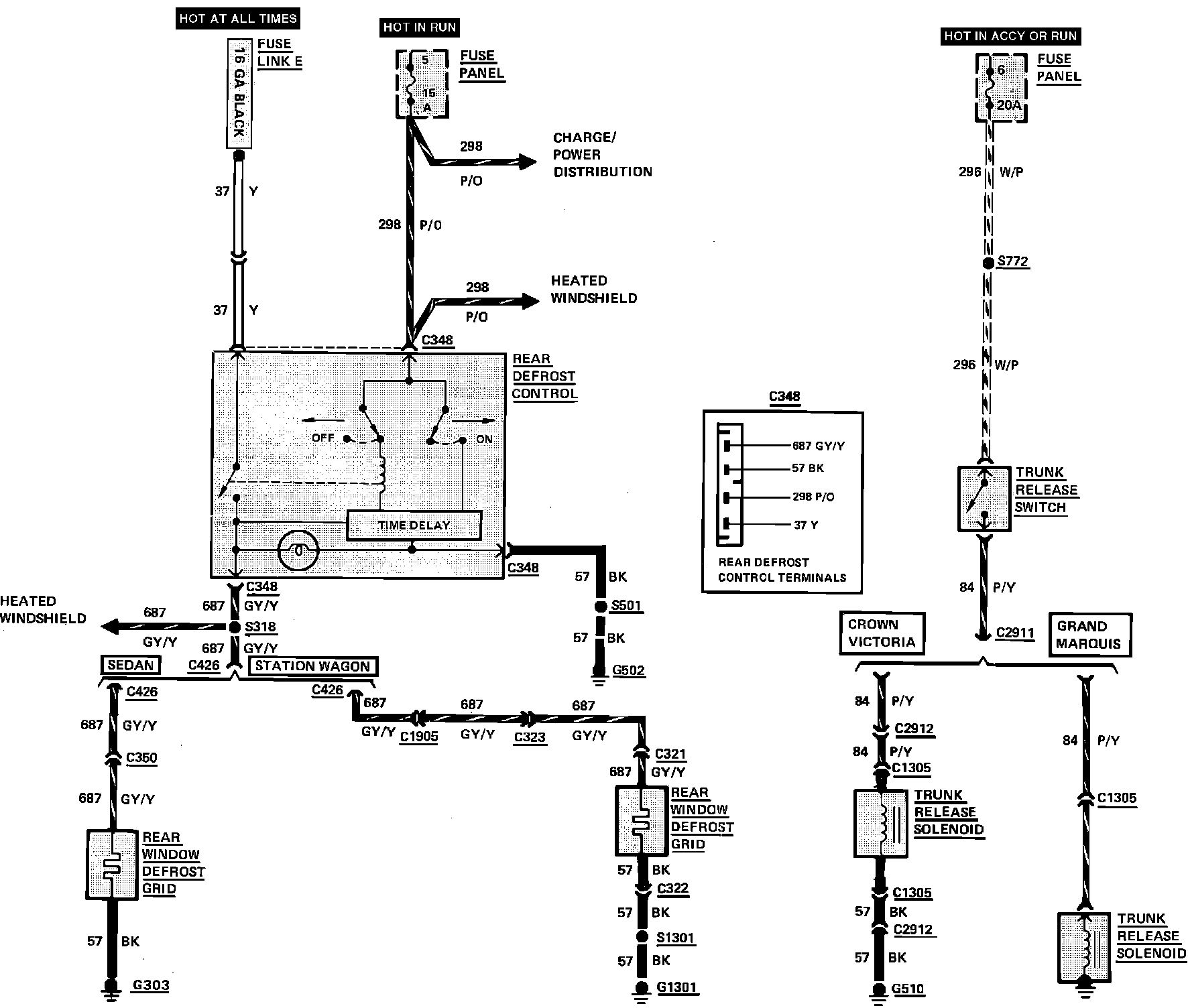 Rear Window Defrost & Trunk Release Wiring Circuit: