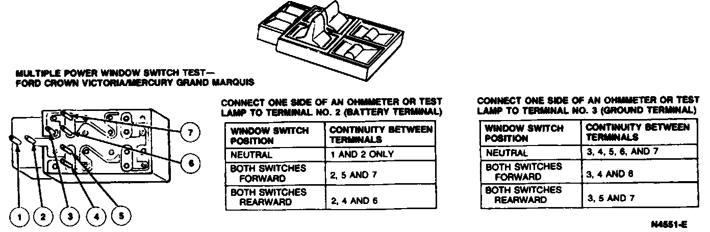 Testing the power window master switch should be performed with the switch removed from the vehicle. Use a self-powered test lamp or an ohmmeter such as Rotunda Digital Volt Ohm Meter 007-00001 or equivalent.