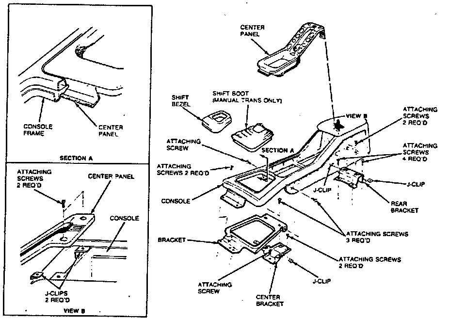 33. Remove floor control center panel by lifting rear edge and moving center panel backward to disengage from console, Fig. 61.
