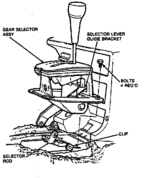 40. Remove four gear selector attaching bolts, then raise gear selector and remove shift rod retaining clip, Fig. 62.