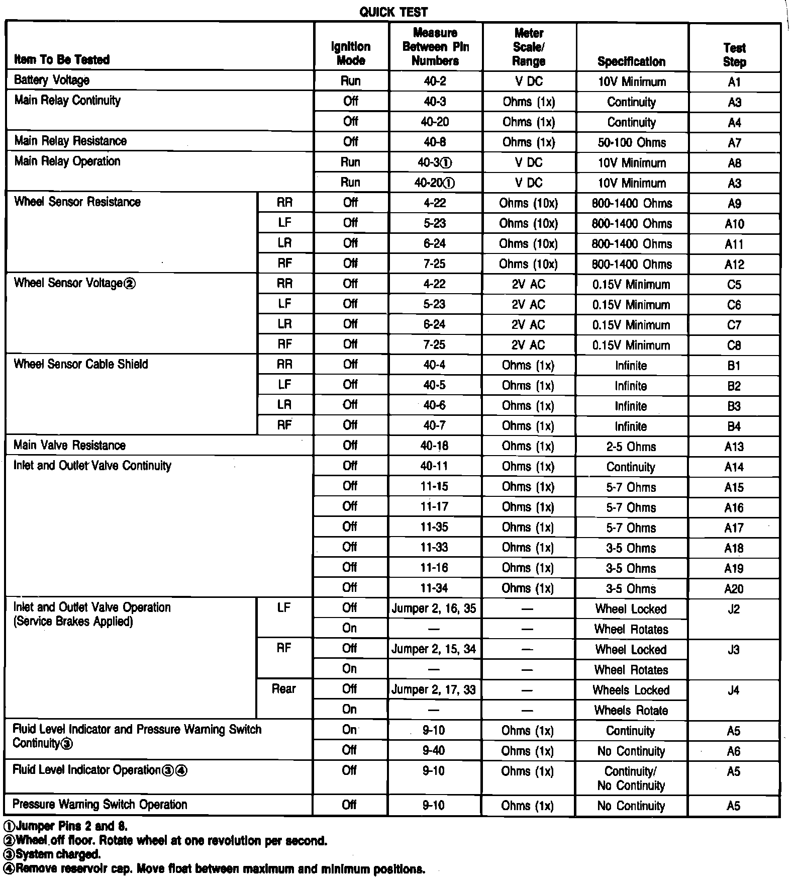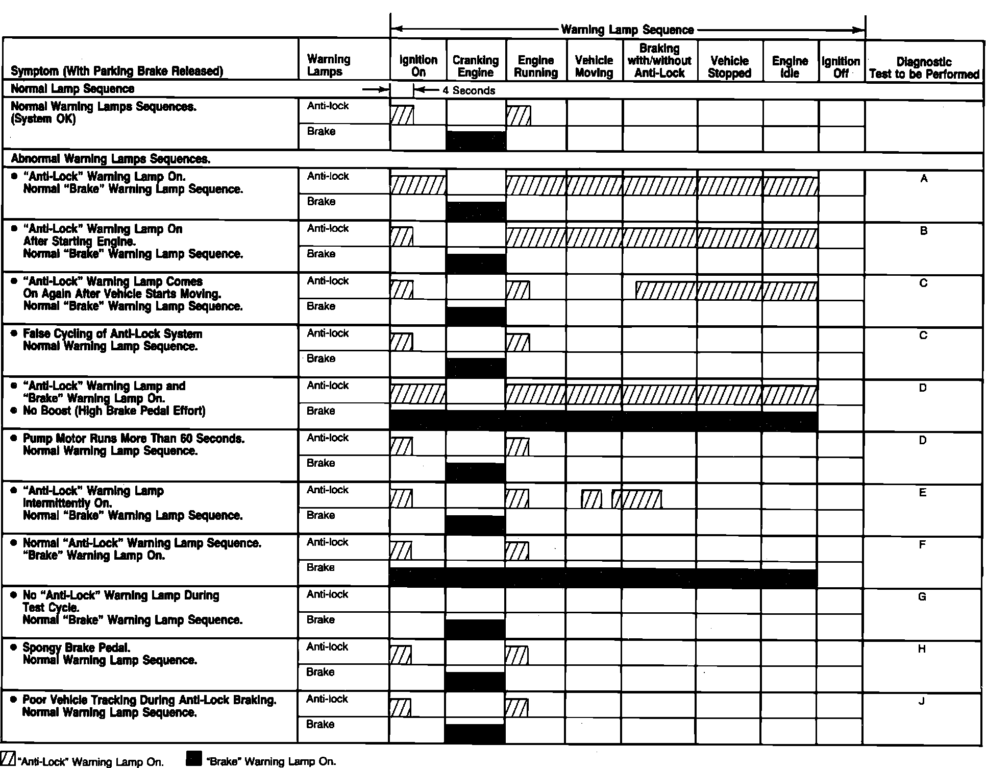 If the Quick Test does not isolate the symptom, it will be necessary to check the operation of the Brake and Anti-Lock indicator lamps. Observe the lamps and compare their on/off operation to the conditions listed on the chart. Once the actual warning lamp pattern has been matched to one of the conditions listed in the chart, perform the specific test indicated.