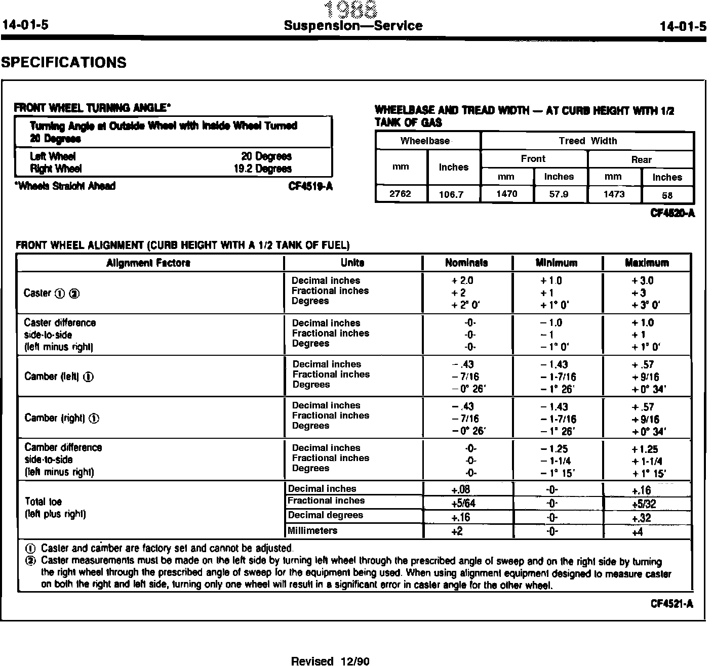 90ford45^ SHOP MANUAL - 1988 - PAGE 14-01-05 - ALIGNMENT SPECIFICATIONS IN FRONT WHEEL ALIGNMENT CHART REVISED