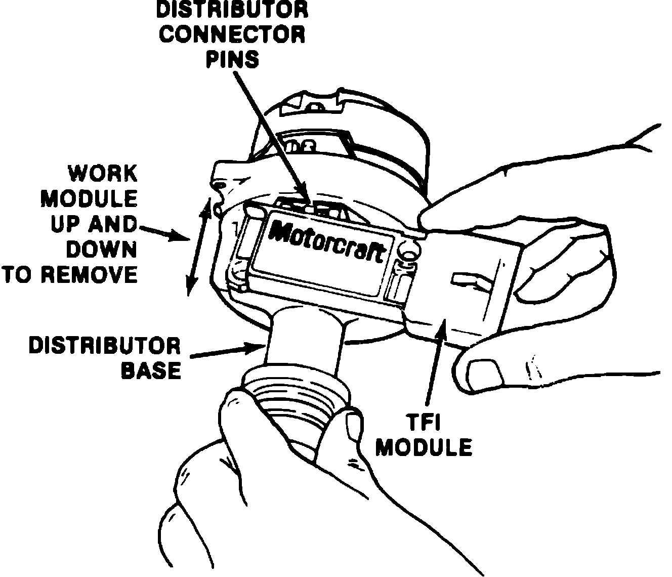 5. Repeat steps 3 and 4 until module terminals are disengaged from connector in distributor base. Do not attempt to lift module from mounting surface before moving TFI module toward distributor flange, otherwise pins at distributor/module connector will break.