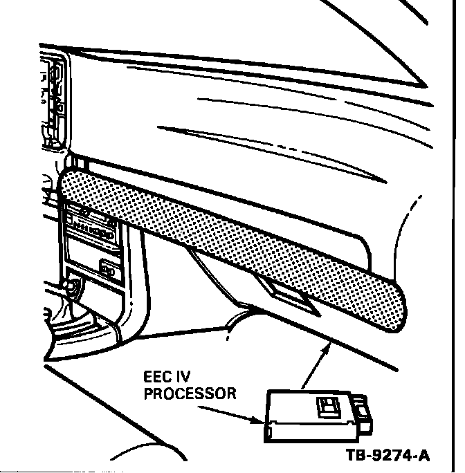 ACTION: If service is required, the EEC IV processor is located in a tray behind the glove box. To gain access to the EEC IV processor, remove four (4) push pins and insulator panel from below the glove box. The EEC IV processor is located on the right hand side of the tray, Figure 5.