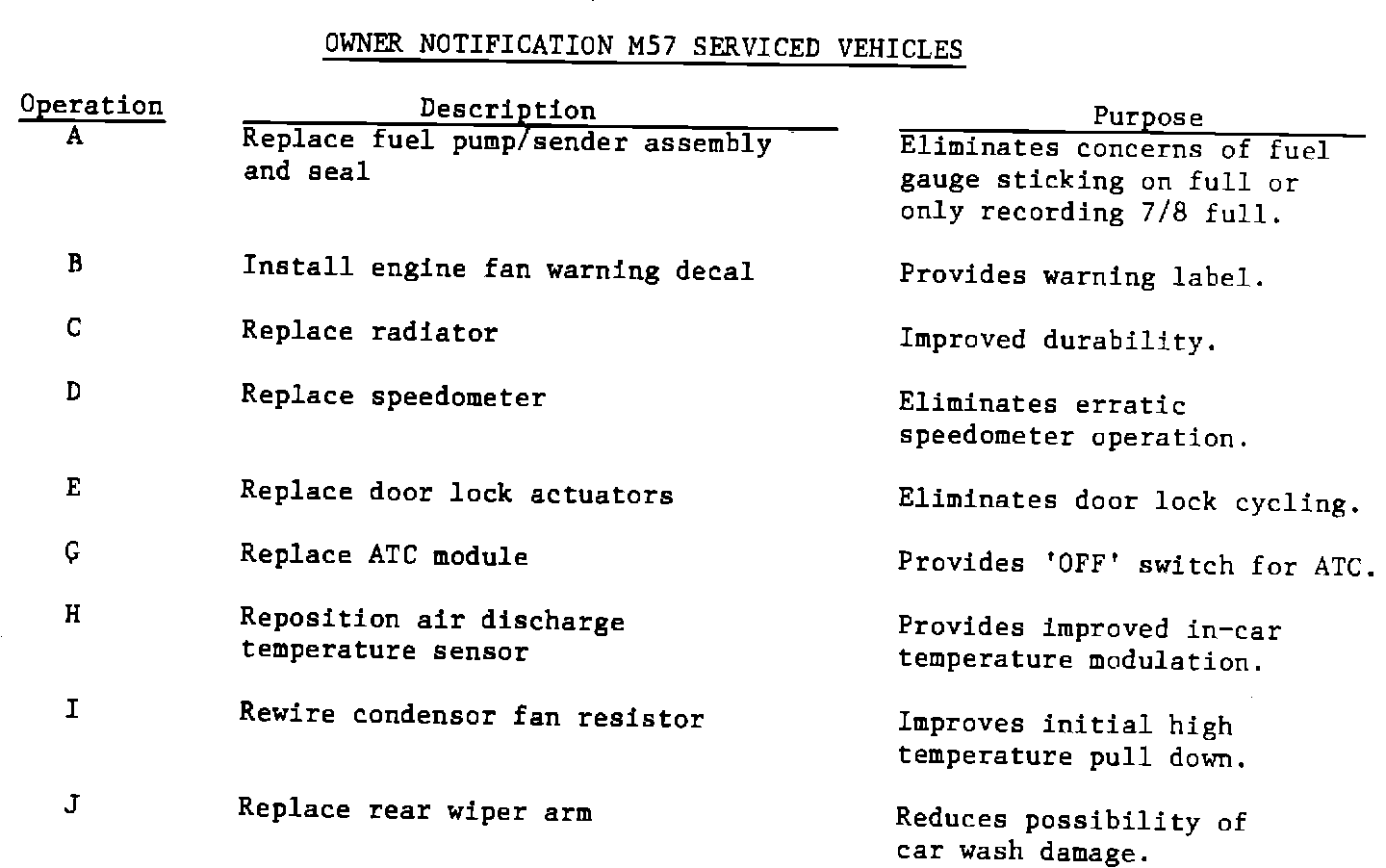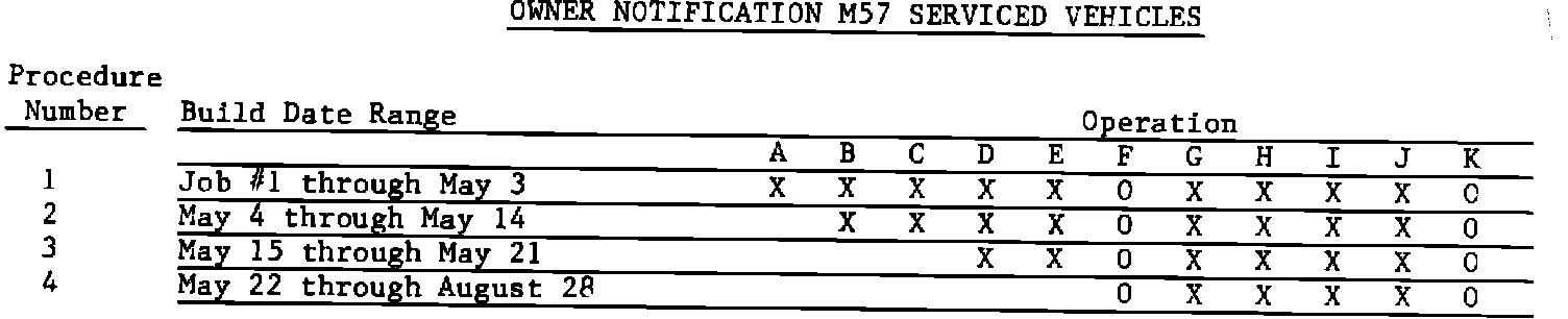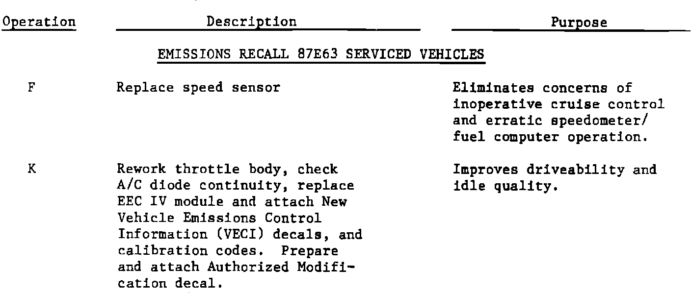 All of the vehicles returned will require Operations F and K under the Emissions Recall 87E63 service. This service is indicated by an "O" in the above chart.