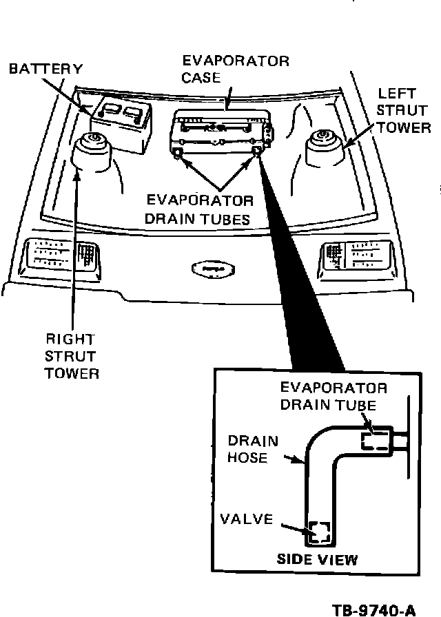 NOTE: THE EVAPORATOR CHECK VALVES ARE IN THE ENGINE COMPARTMENT INSIDE THE PREFORMED DRAIN HOSES, FIGURE 12.