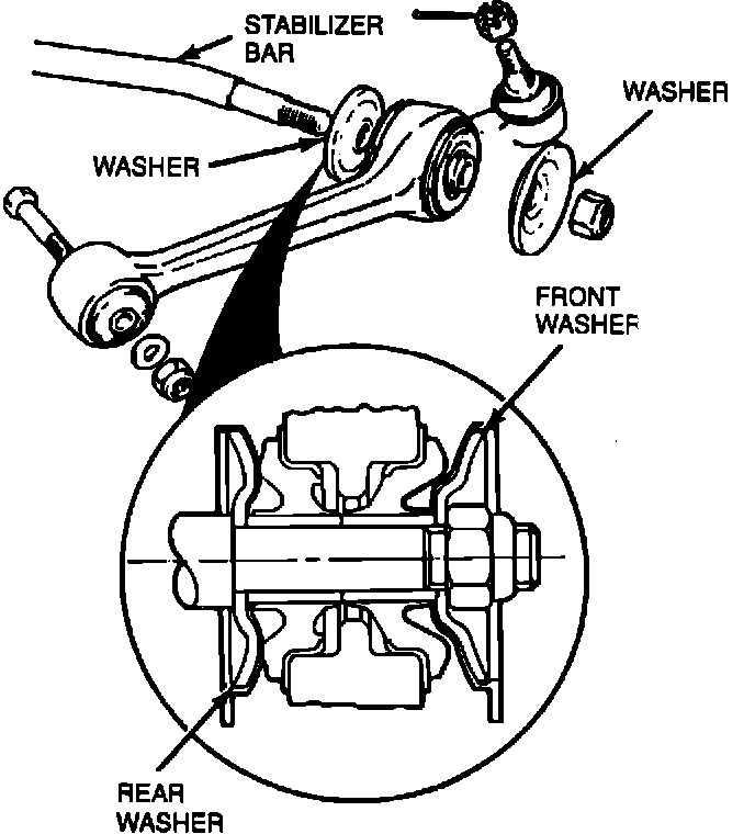 21. Tighten the stabilizer bar to control arm attaching nut to 52-81 ft.lbs. (70-110 N-m). Make sure the front washer does not rotate with the nut during tightening.