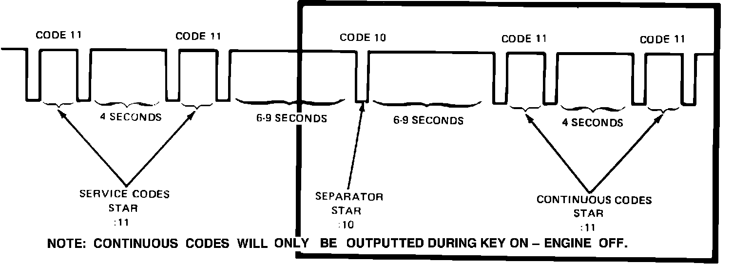 The continuous monitor test service codes are separate from the Quick Test Key-ON, Engine-OFF codes by a single separator pulse, Fig. 23. The continuous monitor codes should never be used for diagnosis until the Key-On, Engine-OFF and Engine Running tests result in a pass code 11.