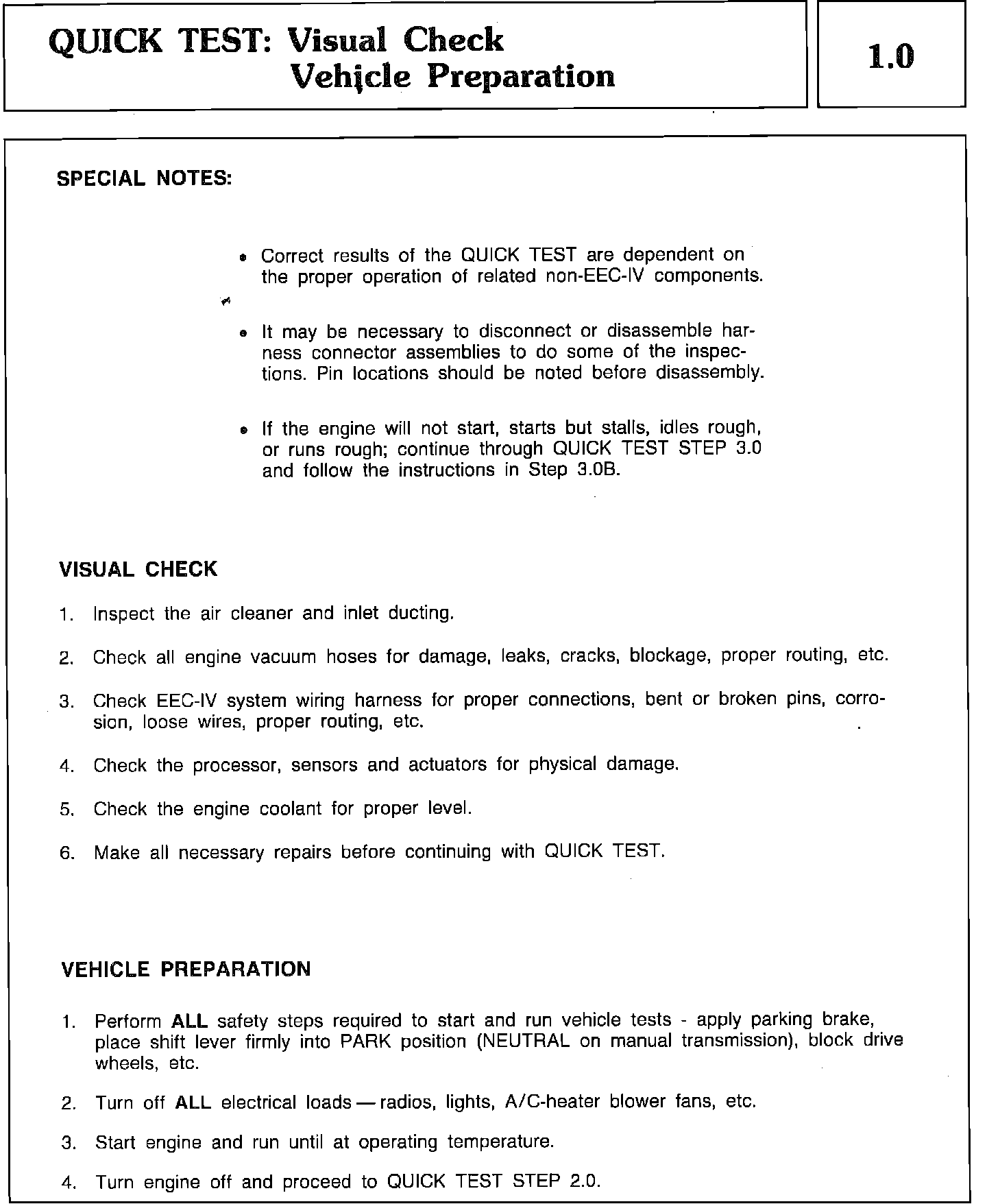 Quick Test 1.0 - Visual Check, Vehicle Preparation: