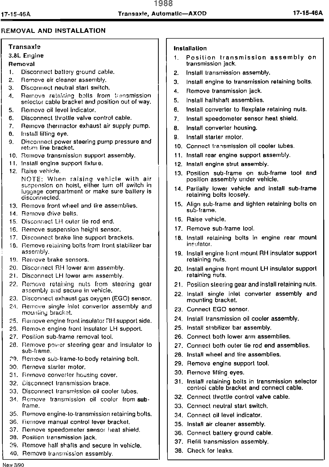 ISSUE: The AXOD Removal and Installation procedures for the 3.8L engine where not available at the time of publication for the 1988 Taurus/Sable Shop Manual