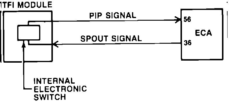The PIP signal is just one of many of the ECA inputs. The ECA takes all the information provided by the input sensors and creates a output signal called SPOUT (spark output). The spout signifies the engine operating condition electronically and is sent back to the TFI module, Fig. 26, for comparison with the PIP signal. The TFI module then uses both of these signals to fire the ignition coil at he proper timing intervals.