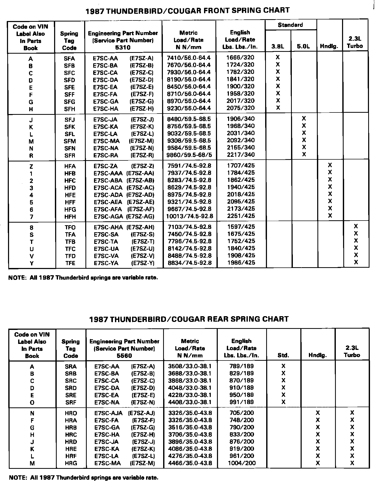 1987 Thunderbird/Cougar Spring Charts