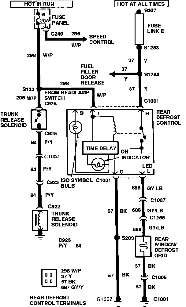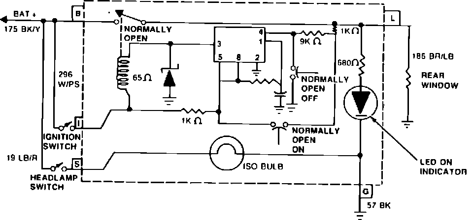 The rear window defrost grid is fed through the relay contacts from the fuse link wire. The input to the rear defrost control assembly from the ignition switch determines if the relay contacts will stay closed when activated by the ON-OFF rocker or buttons. When the ignition switch is in RUN position, moving the rocker or button to ON closes the relay contacts and also activates the timing circuit. The relay contacts will remain closed until they are opened by