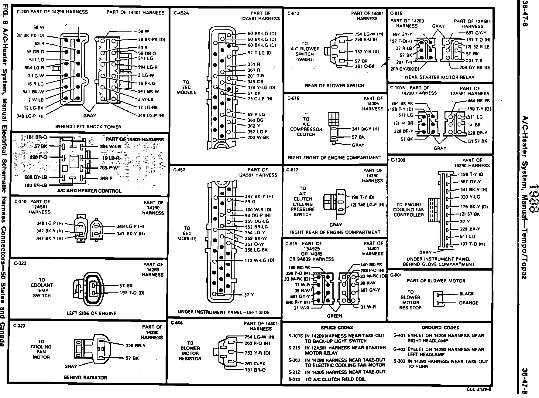 ISSUE: The A/C - Heater Control connector, shown on page 36-47-8 of the 1988 Tempo/Topaz Shop Manual, Volume 1 of 2, is incorrectly illustrated.