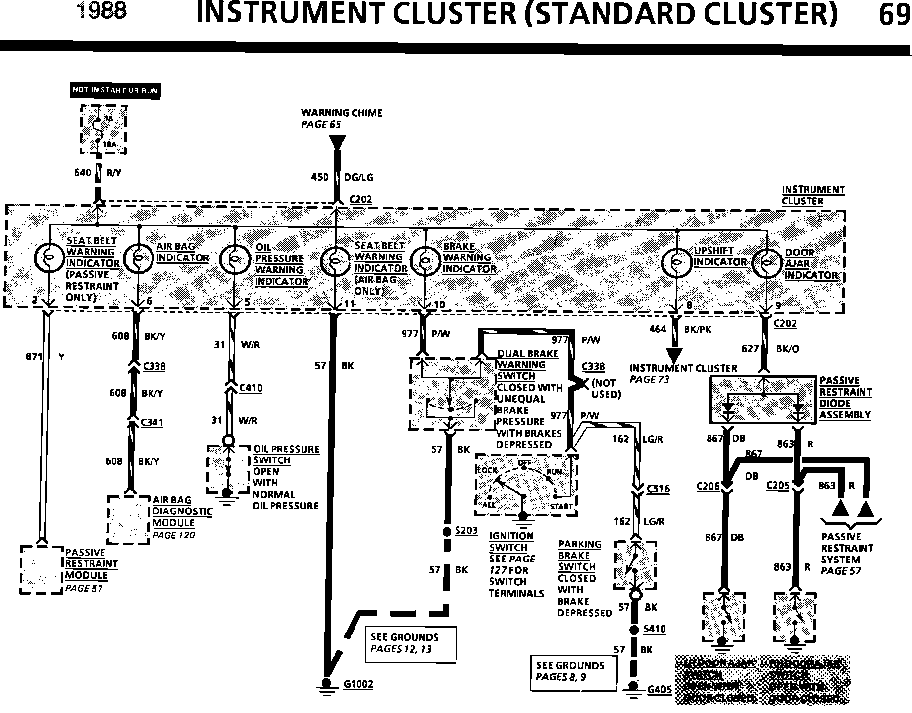 ISSUE: The Instrument Cluster (Standard Cluster) schematic on page 69 of the 1988 Tempo/Topaz EVTM incorrectly shows the LH and RH Door Ajar Switches as "CLOSED WITH DOOR CLOSED".