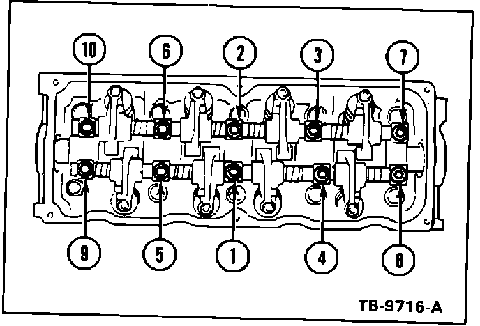 CAUTION: IT IS IMPORTANT TO FOLLOW THE ROCKER ARM SHAFT TORQUE SEQUENCE AND SPECIFICATION OR CAMSHAFT DAMAGE COULD OCCUR.