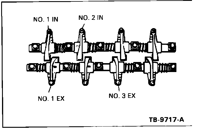 2. Remove the rocker arm shafts and camshaft thrust plate. Move the camshaft so that the camshaft and cylinder head bearing surfaces are exposed.
