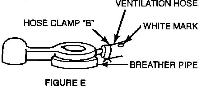 Install the ventilation hose from Repair Code "A" part kit onto the "breather pipe" with its white mark directed upward. Position hose clamp "B" with the clamp facing down. (Figure E.)