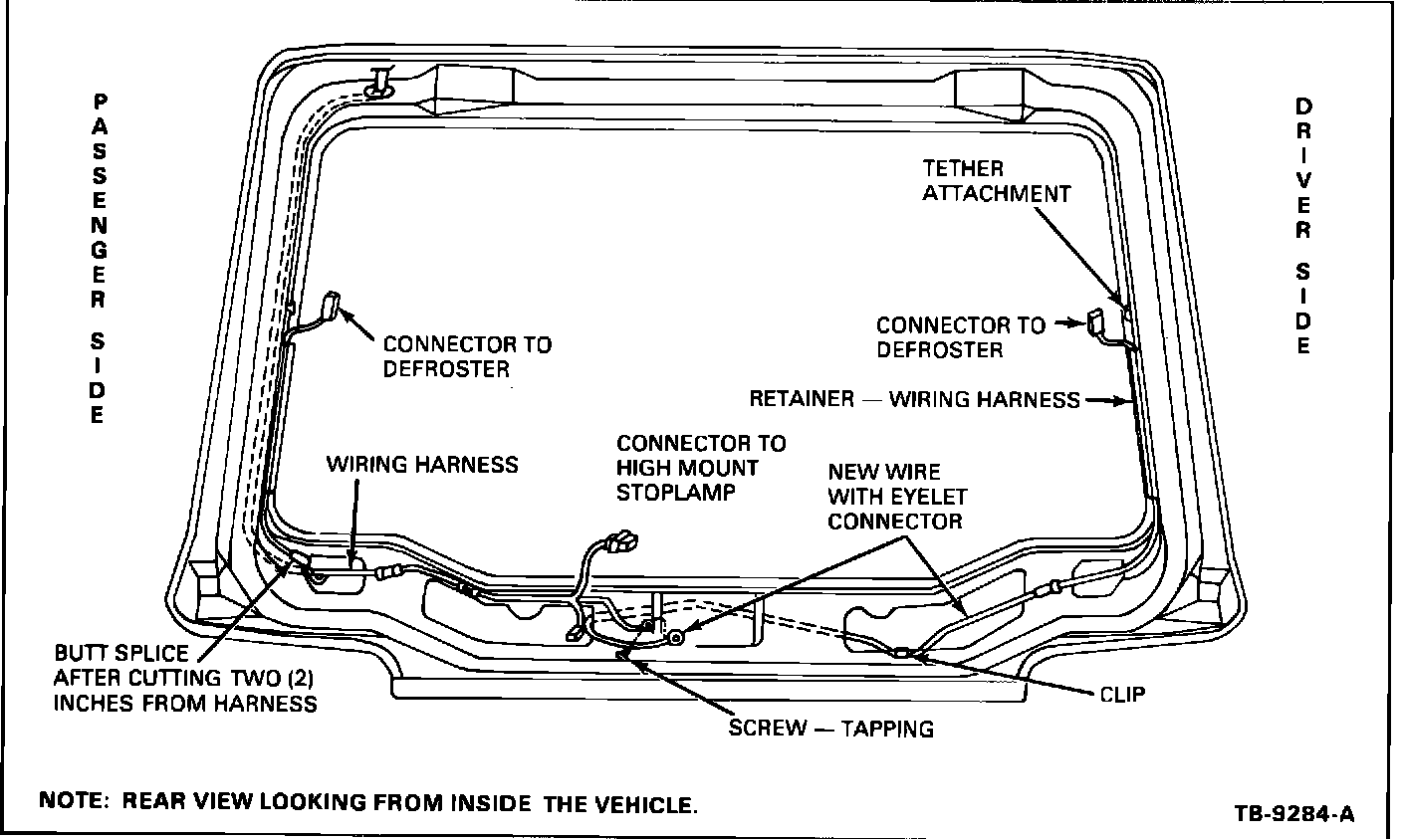 4. Remove and throw away the driver's side, heated backlite wire. Save the self-tapping screw. Route the new wire with eyelet through the clip and attach with the self-tapping screw, Figure 2.