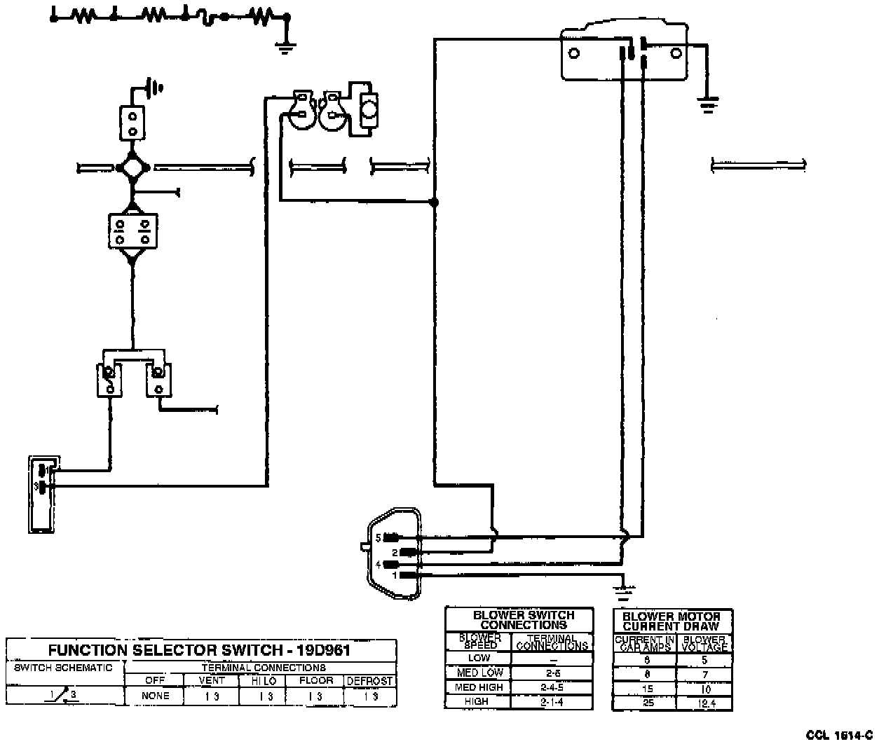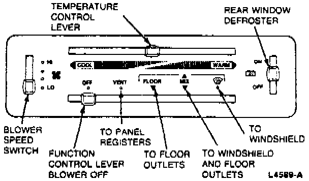 The manual heater and power ventilation control includes a function control lever for Off, Vent, Floor, Mix, and DEFROST that determines the manner in which the system will operate. The system has a temperature control lever for manually setting the desired comfort temperature and a blower switch to control the volume of air movement. Each position of the function control lever and blower switch is detented for positive engagement. The blower switch provides four manually selected blower speeds and may be operated in any position to select the desired amount of air flow.