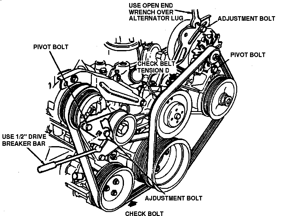 7. Install drive belt by inserting pry bar as outlined in Step 1. Refer to decal located on top of windshield washer/coolant expansion reservoir for proper belt routing.