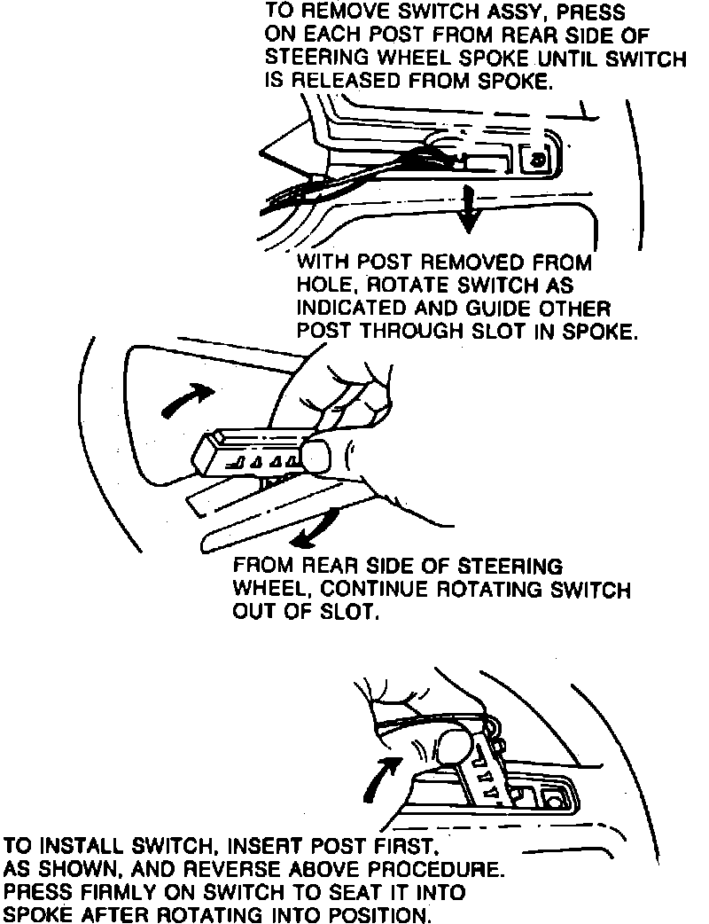 1. Remove center horn pad by inserting a punch through holes in back of steering wheel. Disconnect horn switch electrical connectors.