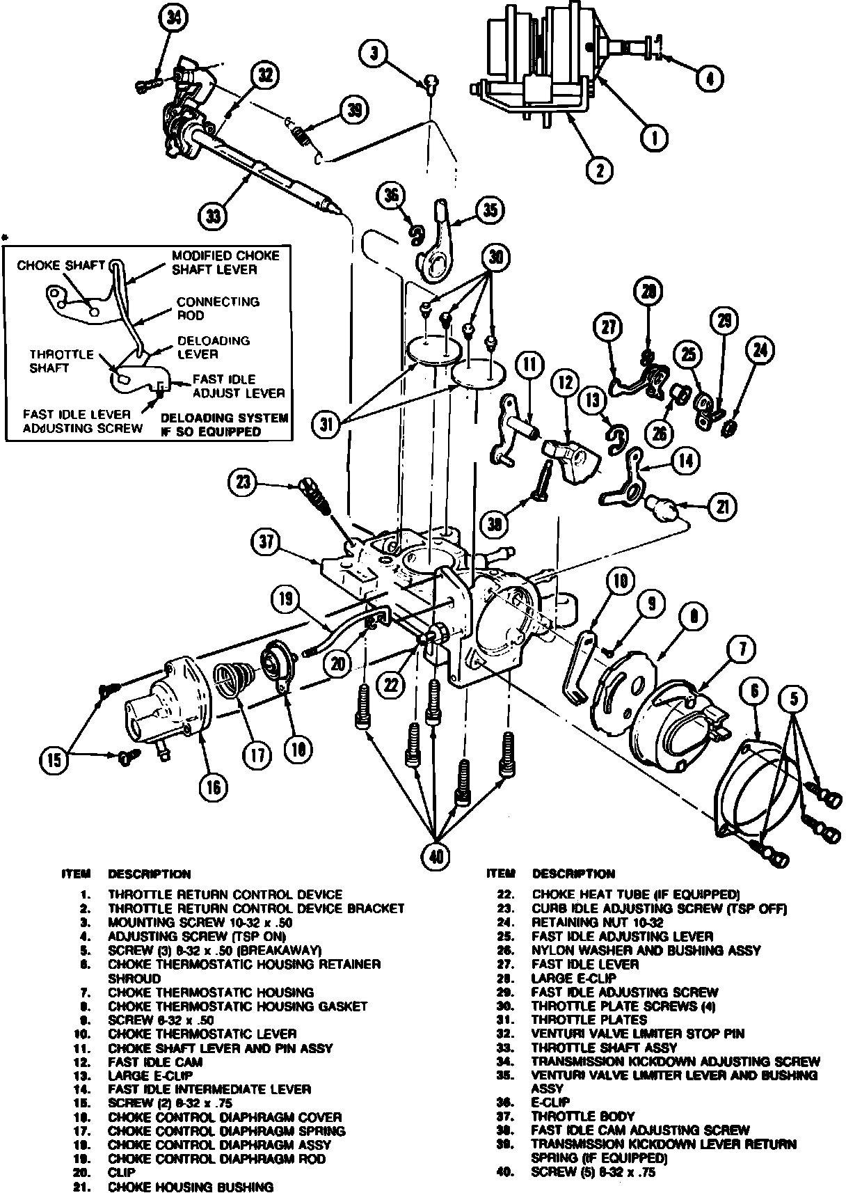 7. Install the fast idle intermediate lever, large E-clip, and the fast idle cam and adjusting screw (13, 13A, 14, 36). Install deloading lever, if so equipped.