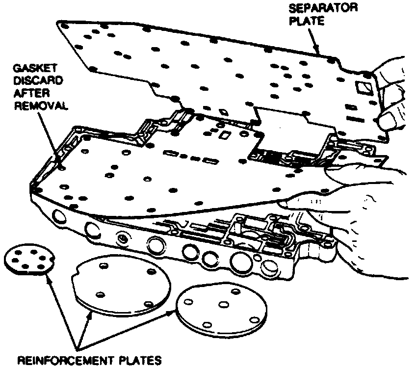 DISASSEMBLE1. Remove and discard valve body gasket, then loosen and remove 11 bolts from reinforcement plates.