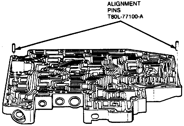 4. Install alignment pins T80L-7710-A, or equivalents, as shown in the Installing Alignment Pins In Valve Body image. These two holes are smaller than other bolt holes to ensure proper alignment of gasket and separator plate with valve body. These two holes also align the valve body gasket and valve body assembly with the case.