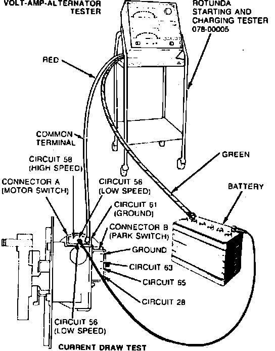 3. Connect a jumper wire from the battery negative post to the low speed terminal on the motor connector and read the current draw.