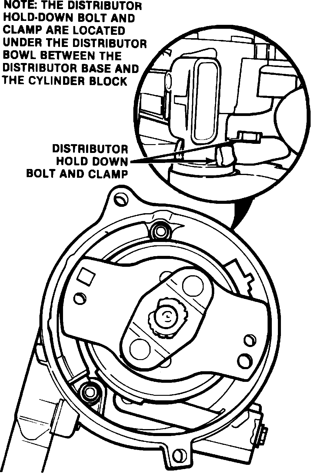 7. Remove distributor hold down bolt and clamp. The distributor hold down bolt and clamp are located under the distributor bowl between the distributor base and the cylinder block.