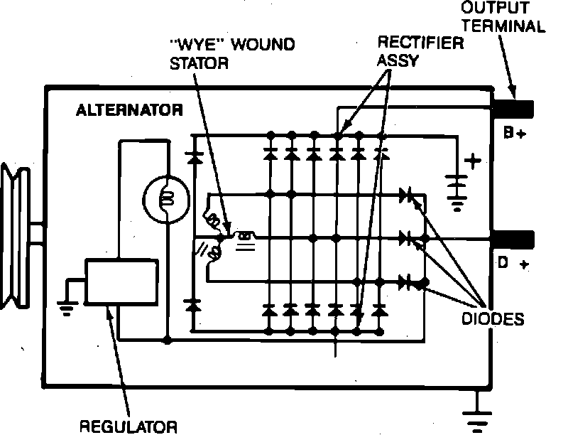 This alternator is conventional design, Fig. 1, with rotor magnetic field spinning within the stationary stator windings. The rotor is supported in the housing on ball bearings which are pressed on the shaft. Field current is supplied through the brush set that rides against the rotor slip rings. Because voltage is induced in ``Wye'' wound stator which produces alternating current, a rectifier assembly is installed between stator and alternator output terminal. The rectifier assembly contains six positive and six negative silicon diodes that allow only the positive side of alternating current to reach the output terminal.