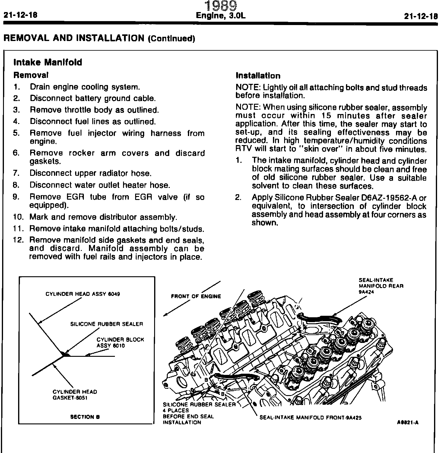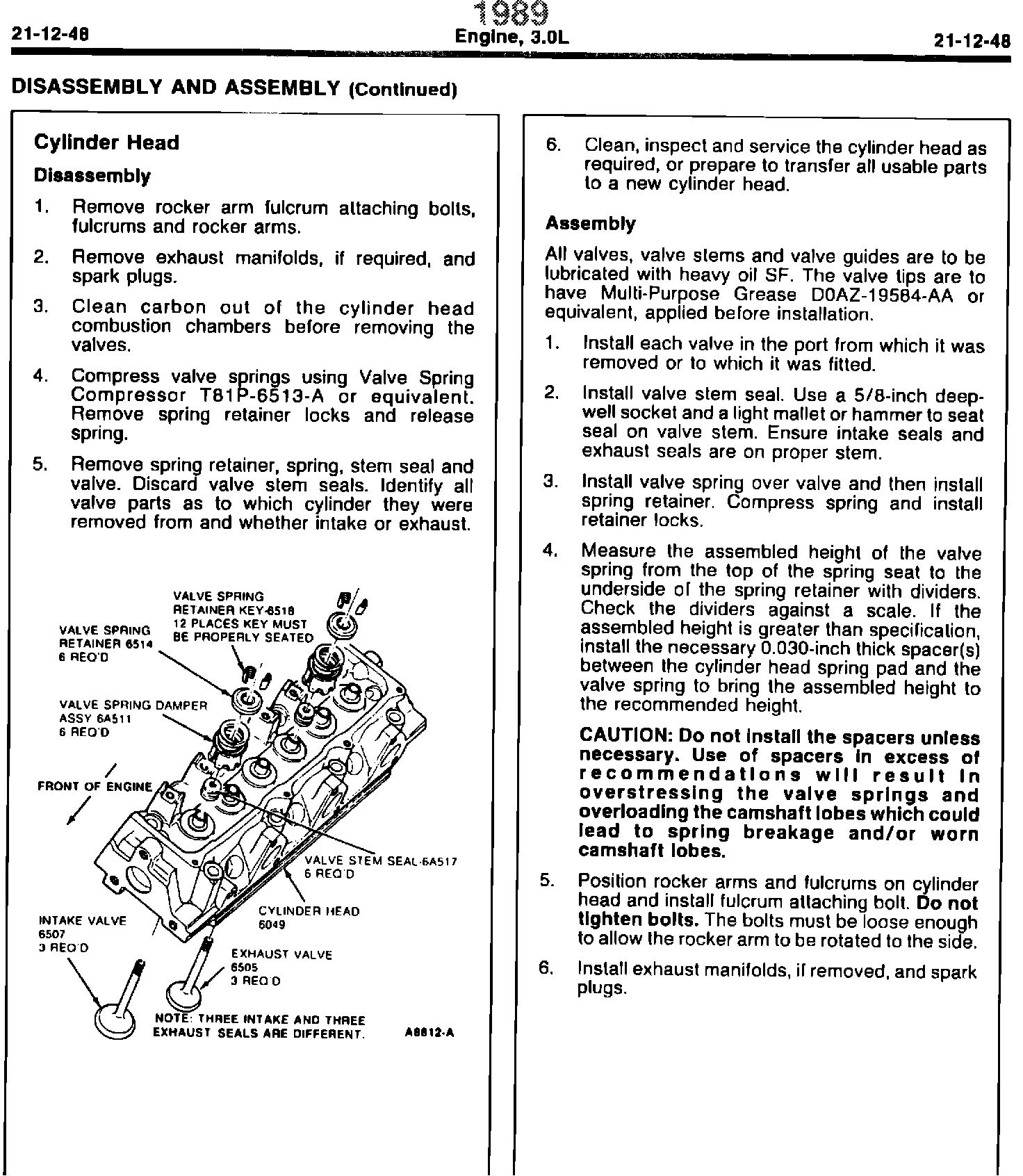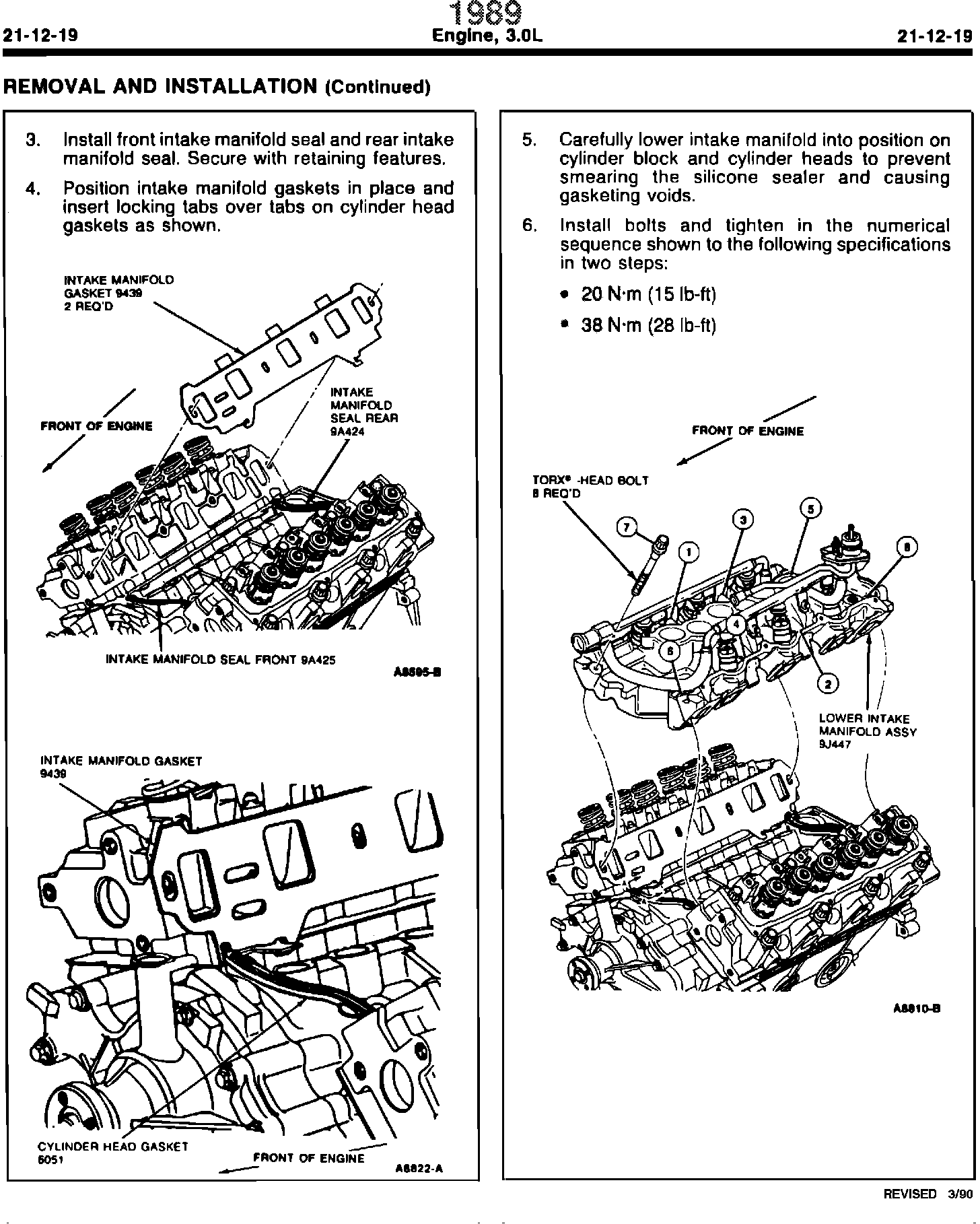 ISSUE: The two step torque settings shown under Step 6 on page 21-12-19 of the 1989 Taurus/Sable Shop Manual have been modified. The footnote 4 in the Torque Specifications chart for 3.0L Engines on page 21-12-49 of the 1989 Taurus/Sable Shop Manual has been modified and changed from three steps to two steps.