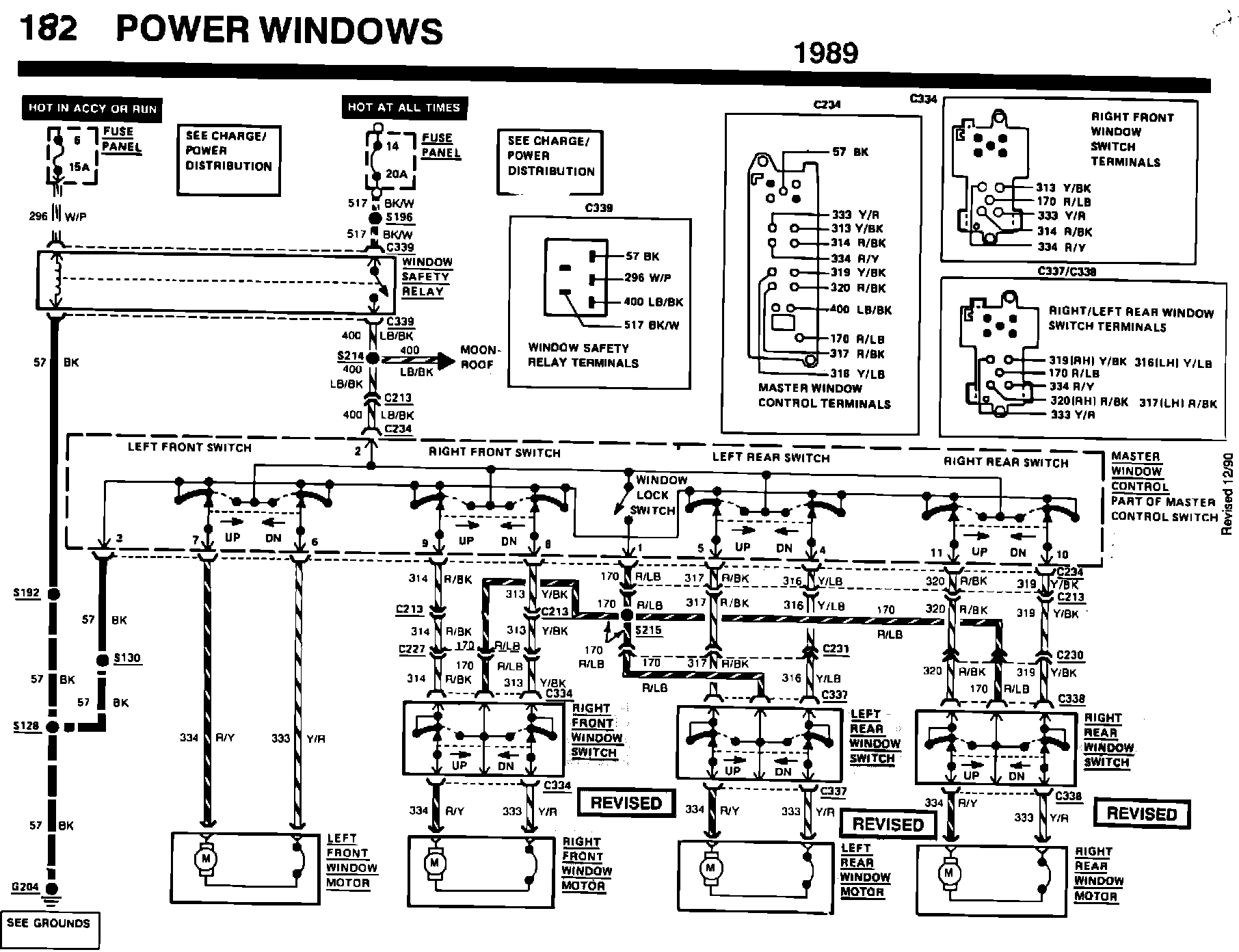 ISSUE: The identification labels for the Right Front and Left Rear Window Switches plus the Right Front and Left Rear Window Motors shown on Page 182 of the 1989 Taurus/Sable EVTM are incorrect.