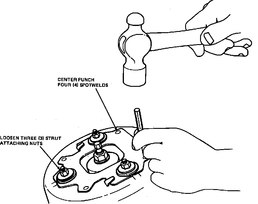 2. Center punch spot welds on both strut alignment plates, then loosen strut attaching nuts, Fig. 2.