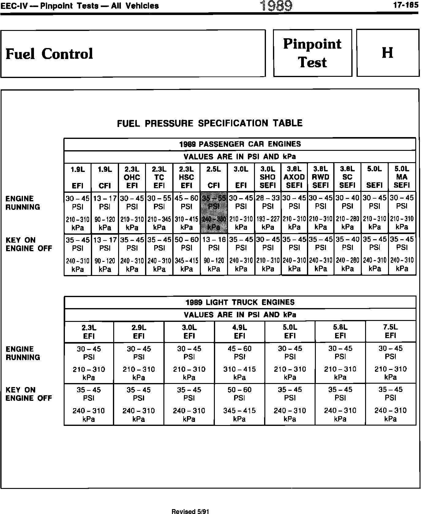 H - Fuel Pressure Specification Table