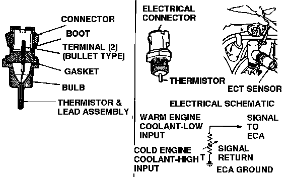 ENGINE COOLANT TEMPERATURE SENSOR (ECT) - Refers to thermistor sensor or its signal line. Sensor is immersed in engine coolant. Provides engine coolant temperature information to ECU which is used to alter spark advance and EGR flow during warm-up or overheat conditions. (Replaces cooling and EGR PVS.)