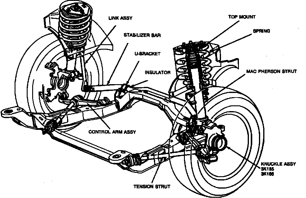 This suspension is of the gas filled MacPherson strut type, Fig. 1. The strut top mount consists of a rubber insulated bearing and seat and coil spring insulator. The top mount is attached to the body side apron by three bolts. The lower part of the strut is mounted in the steering knuckle and is retained by a pinch bolt. A forged lower control arm is attached to the sub-frame and to the steering knuckle. A tension strut is connected to the lower control arm and to the forward part of the sub-frame.