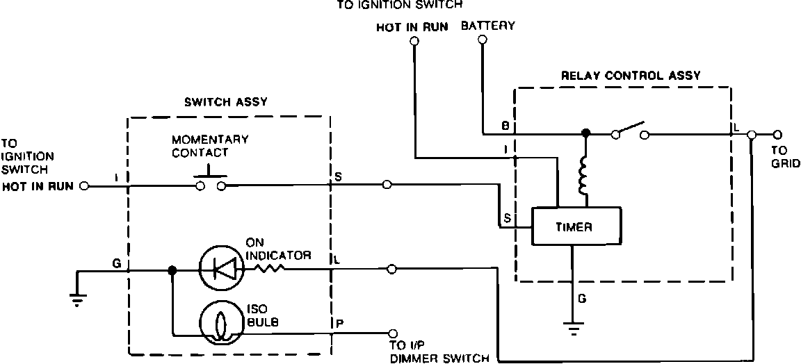 As soon as the switch is depressed to the ON position, it electrically connects power to energize the timer relay coil, thereby causing the normally open relay load contacts to close and provide power to the ON lamp and the rear window grid wires. The grid wires will continue to receive power for approximately 10 minutes.