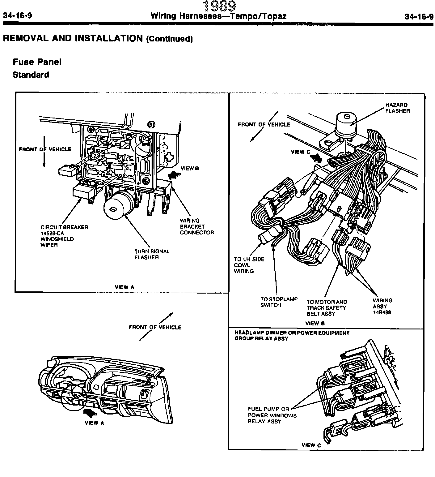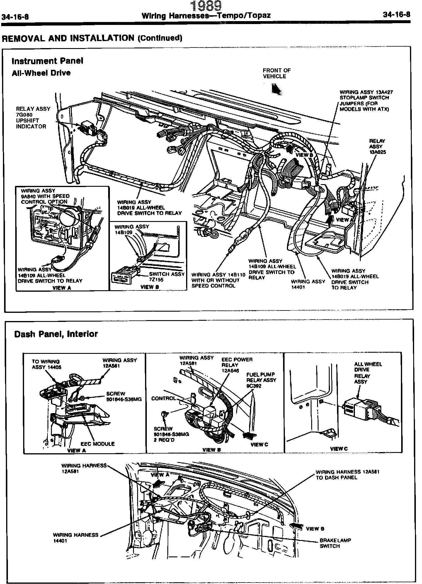 ISSUE: The upshift indicator relay was not included in the 1989 EVTM or 1989 Shop Manual. The affected illustrations are on page 34-16-8 of the 1989 Tempo/Topaz Shop Manual and page 46 of the 1989 Tempo/Topaz EVTM.