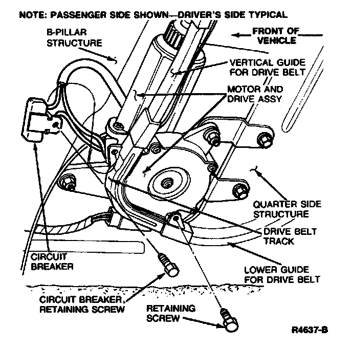 9. On two-door Escort model, install screw adjacent to motor retaining lower drive belt guide.