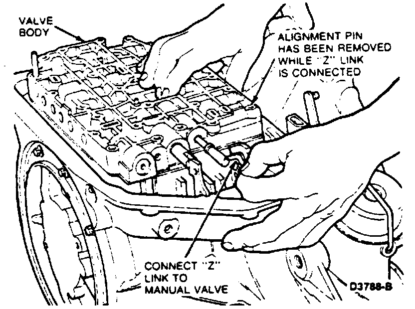 46. Install Z-link in manual valve while positioning valve body on case. One alignment pin has to be removed to allow the Z-link to be installed in the manual valve. Ensure roller on end of throttle valve plunger has engaged cam on end of throttle lever shaft.
