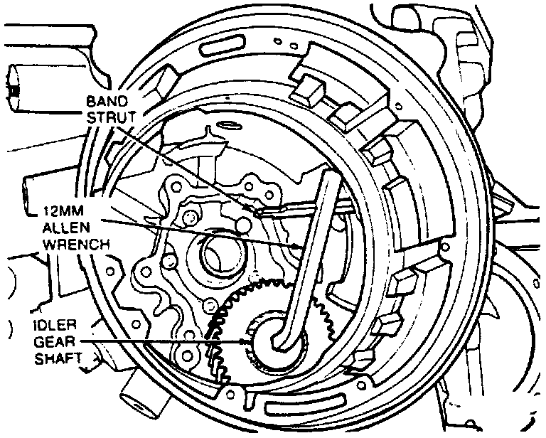 2. Position idler gear and shaft assembly in case, install a 12 mm Allen wrench in idler gear shaft and rotate it until it catches on band anchor strut.